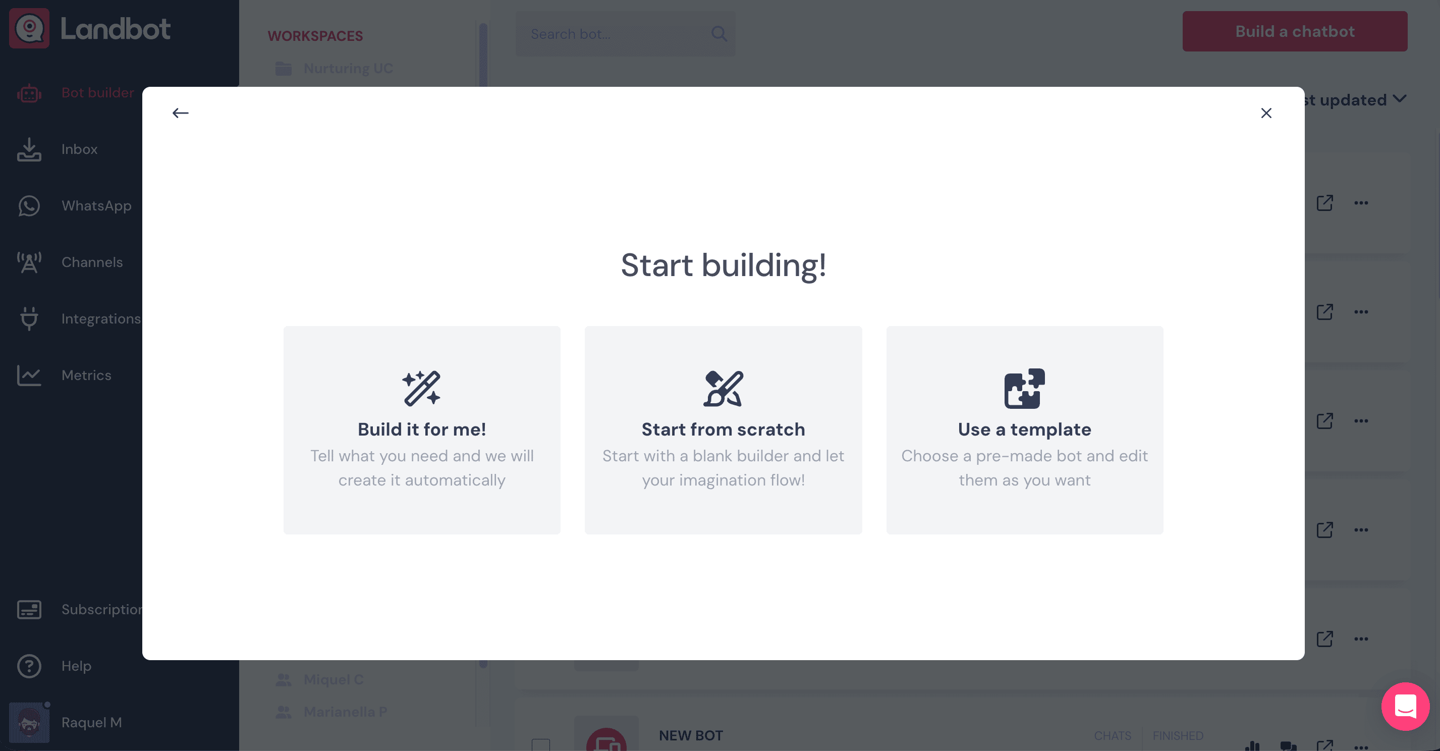 After logging into your Landbot account (or signing up for free if you don’t have one yet), simply go to the Bot builder section and click on "Build a chatbot" in the upper right corner, or click on the channel where you want to launch your Agent. Let's select Web.